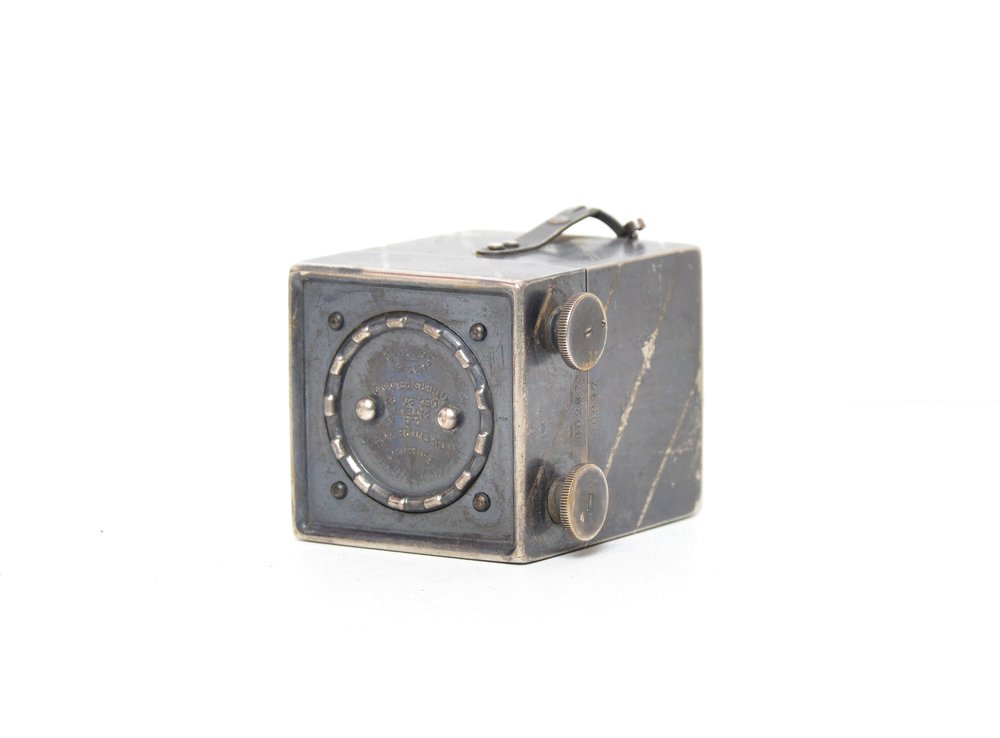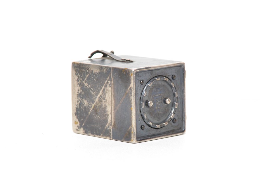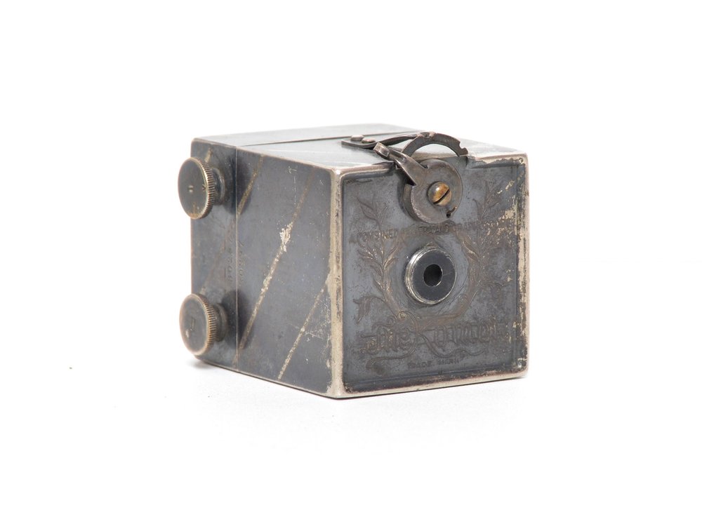 Appareil miniature en métal prévu pour 25 vues rondes de 2,8 cm de diamètre sur pellicule.